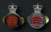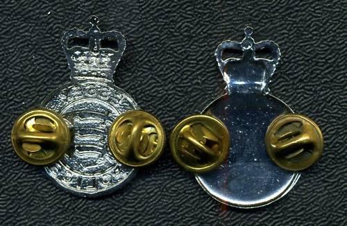 OBSOLETE, British, ESSEX POLICE, collar badge lot. Queens Crown. One Officer's, black and red enamel on chrome and one Men's red paint on chrome. Both clutch pin fasteners.