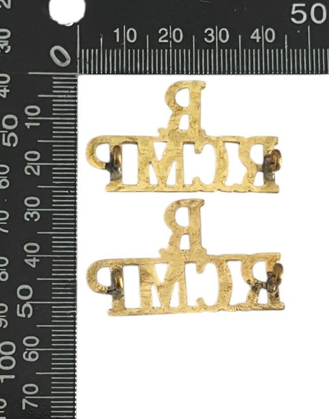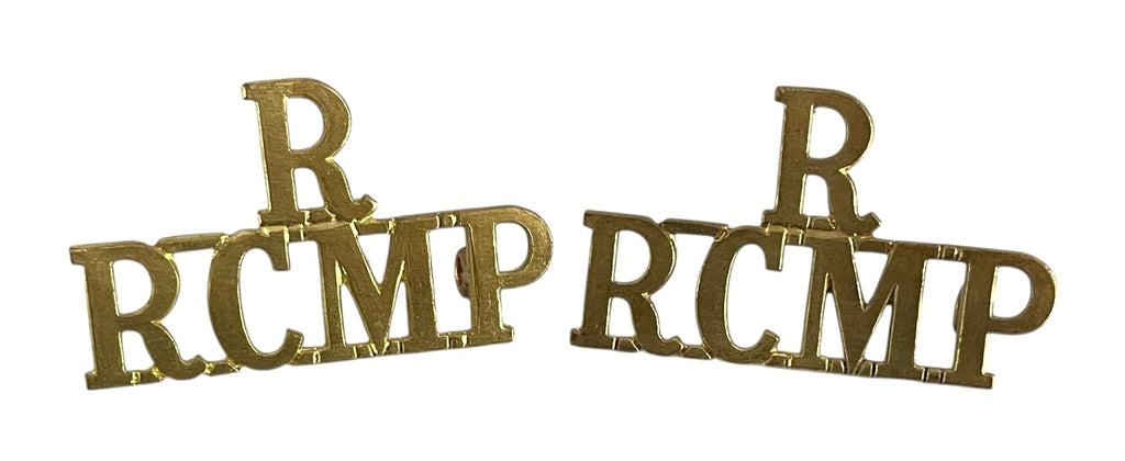 A nice pair of brass R over RCMP Shoulder title, each with lugs on the reverse.