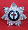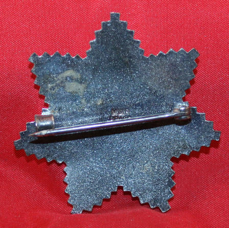 Masonic Breast / Cap Badge. Two piece design. Frosted white metal 7 pointed star with enameled decal attached. Pin back, maker stamped MUIR BRAND.