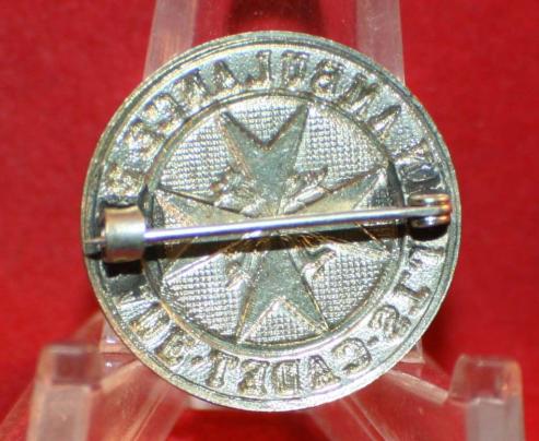 St. John's Ambulance Brigade Cadet Head Dress Pin / Cap Badge. Chromed white metal. 25mm wide. Pin with hook catch fastener.