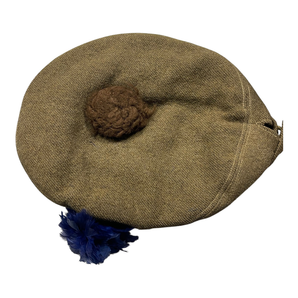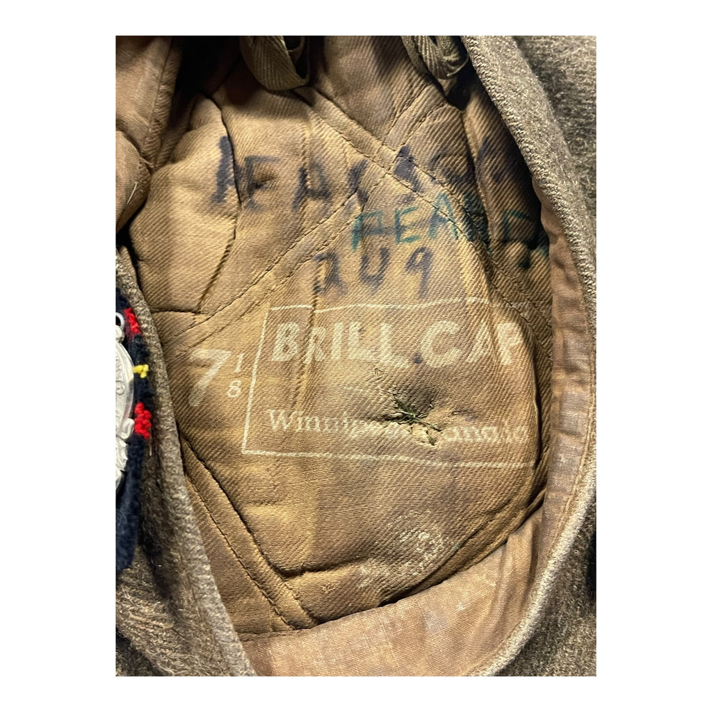A really nice made in Winnipeg Brill Cap, with C broad arrow, size 7 1/8. Date is hard to read 194?. With name that appears to be Pearson.  With white metal badge and blue hackle with tartan backing. Shows use and wear.