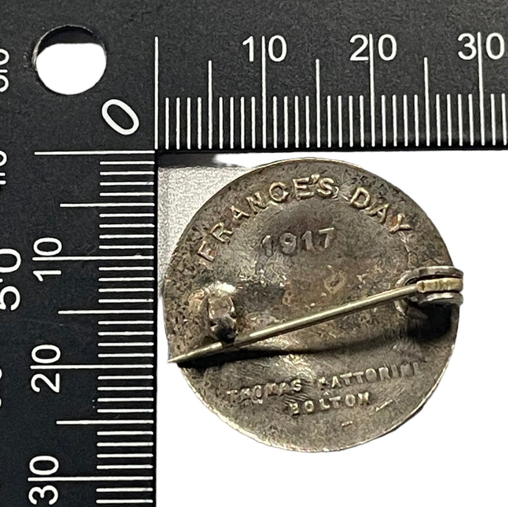 Silvered metal, pin back, hook catch. Marked on back FRANCE'S DAY 1917 . Maker is THOMAS FATTORINI. BOLTON.