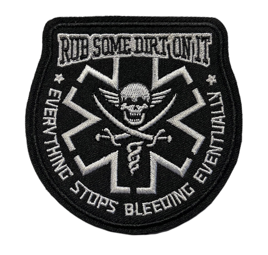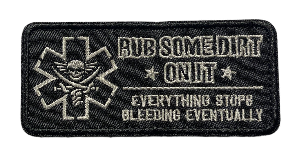 Rub Some Dirt on It Everything Stops Bleeding Eventually. Embroidered. Velcro backed. Grey on Black.