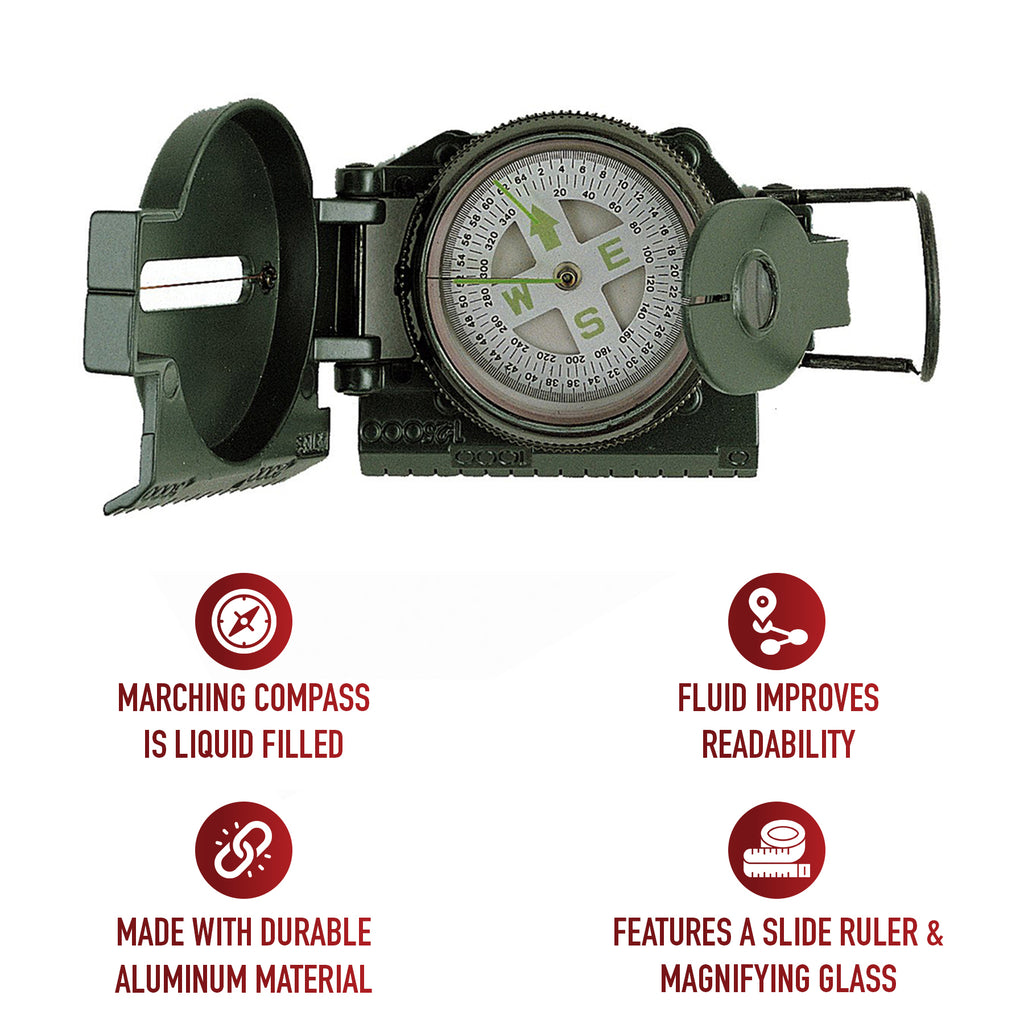 Embark on your outdoor journeys with confidence using Rothco's Military Marching Compass. Designed for military use, this compass is a reliable navigation tool for active-duty personnel, adventurers, hikers, campers, and outdoor enthusiasts. Constructed with precision and durability in mind, Rothco's Military Marching Compass features a liquid-filled design that minimizes excessive swing or wobble, ensuring optimal accuracy even in challenging terrain or conditions. This fluid enhances readability and protects the compass's internal mechanisms from wear and tear during extended use. Equipped with essential navigational aids, this compass includes a slide ruler for precise measurements and calculations, allowing you to plot your course with accuracy. The integrated magnifying glass provides clear visibility of map details and fine print, enhancing your ability to interpret topographic maps or trail guides. Crafted with an aluminum cast case, Rothco's Military Compass is built to withstand rugged outdoor environments, ensuring reliable performance in any situation. Its sturdy construction offers protection against impacts, bumps, and other hazards encountered during outdoor expeditions. Available in three distinct colors, including black, olive drab, and coyote brown, the compass allows you to choose the option that best suits your preferences or blends seamlessly with your outdoor gear and apparel. Whether you're embarking on a hiking expedition, navigating unfamiliar terrain, or exploring the great outdoors, Rothco's Marching Compass is an essential tool for ensuring you stay on course and reach your destination safely. With its durable construction, reliable performance, and versatile features, this compass is a must-have addition to your outdoor gear collection.