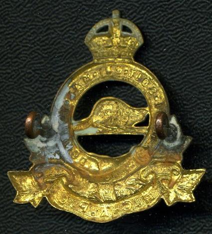 Royal Canadian Army Pay Corps Cap Badge, Kings Crown, pre 1953 issue. Brass. Lug fasteners. W SCULLY LTD Maker stamped.