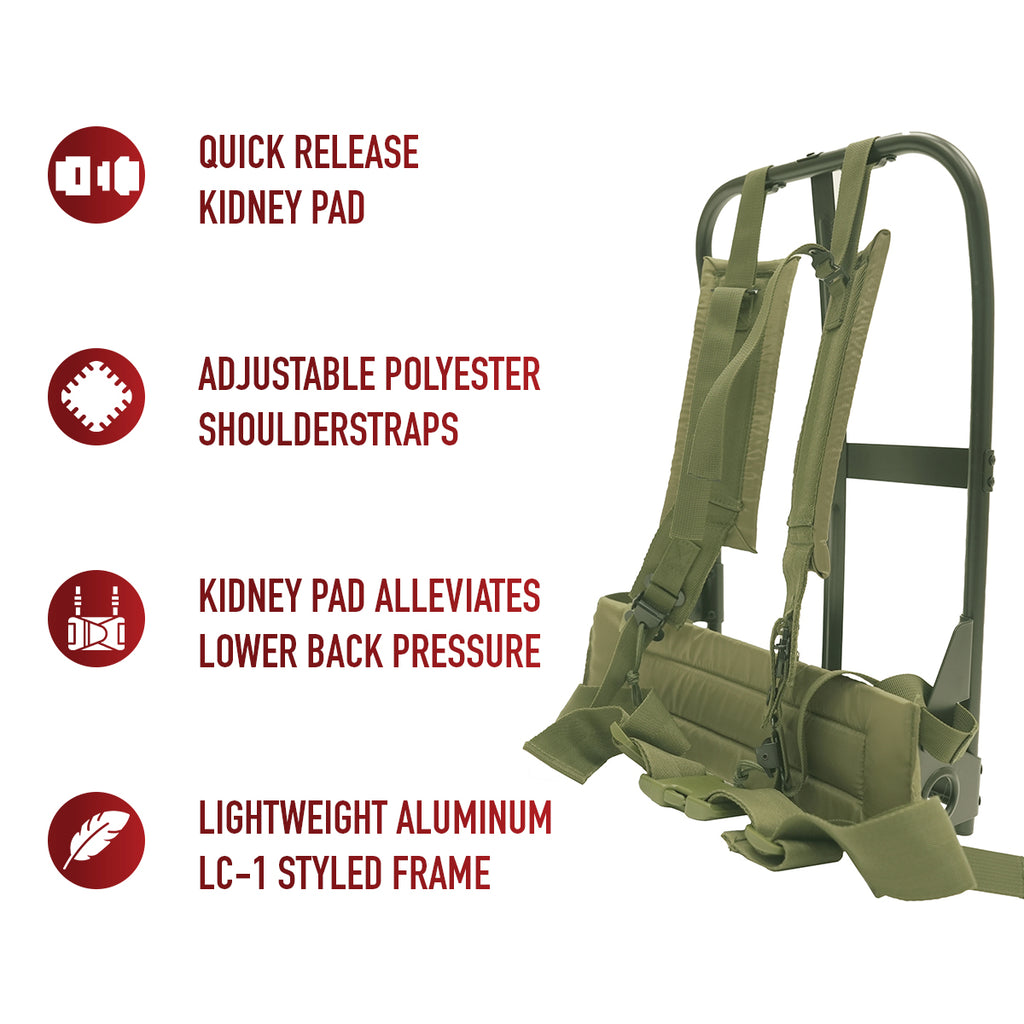 Rothco’s Alice Pack Frame is built to fit all G.I LC-1 packs and balance the load of the gear you are carrying with the sturdy aluminum frame. These military pack frames are built to last long expeditions with comfortable and resilient polyester shoulder straps and waist belt. Whether you are in the military, going on outdoor explorations, or making a Ghostbuster proton pack for Halloween, the backpack frame is the perfect tool to carry and balance all the gear you need.