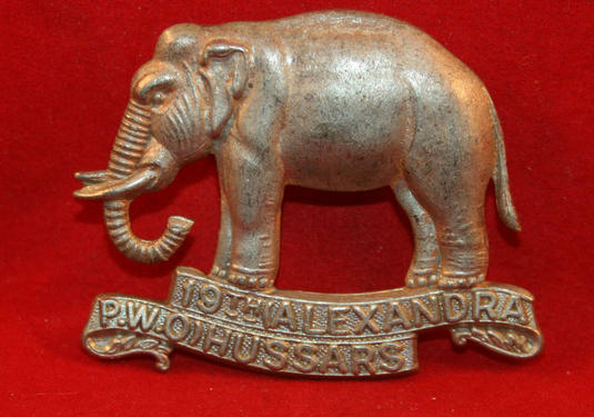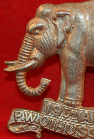 British Army: 19th (Alexandra P.W.O.) Hussars Cap Badge (Elephant). Light weight White metal. Copper Lug fasteners. 48mm wide (banner ot banner), 40mm tall. Prince of Wales. A copy.