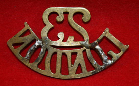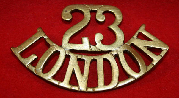 23rd County of London Shoulder Title. Brass metal. 23 over LONDON, curved down. Fasteners removed. 31mm high by 52mm wide.