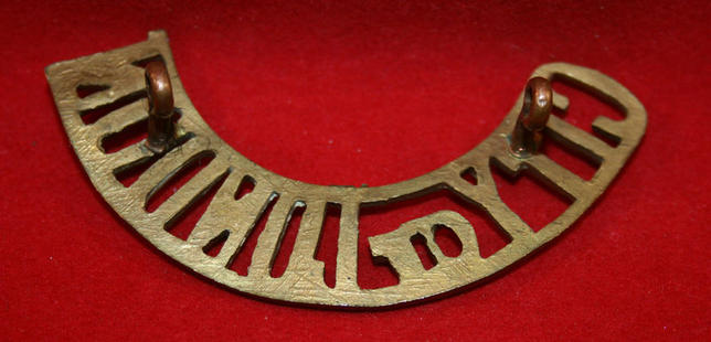 City of London Shoulder Title. Brass metal. CITY OF LONDON, curved down. 12mm high. Lug fasteners. Appears that there was something attached in centre of the curve, could have been Volunteers V.