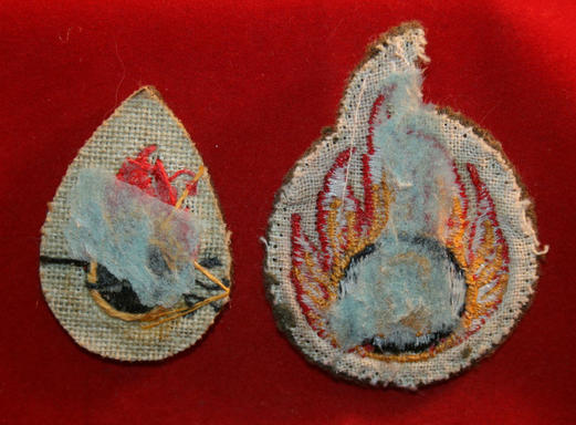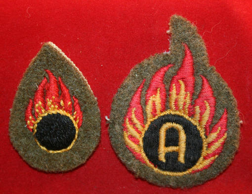 British Army: Cloth insignia Lot: Ammunition Technician RAOC. Both with glue & paper residue on the back. The larger patch has holes along the edge from wear.