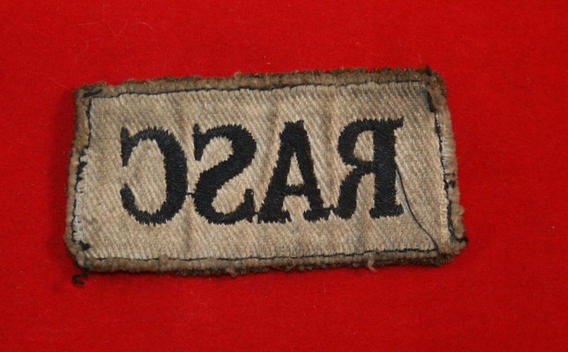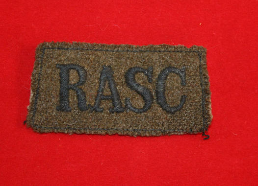 British Army Cloth Shoulder Title: ROYAL ARMY SERVICE CORPS RASC. Black on Khaki. Worn condition. Embroidered. Nice.
