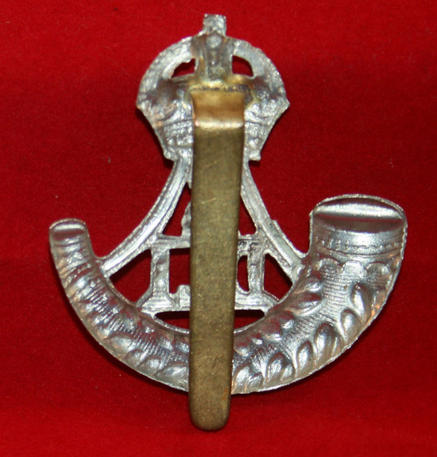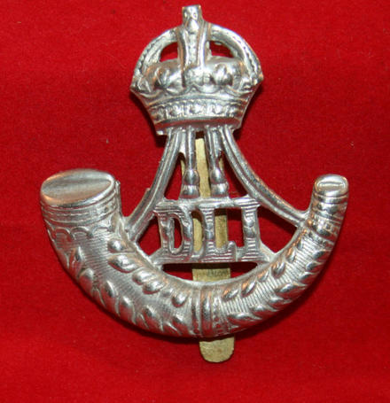 British Army: Durham Light Infantry Cap Badge. White metal. Slider fastener. Kings Crown, Pre 1953 issue.