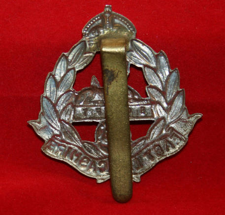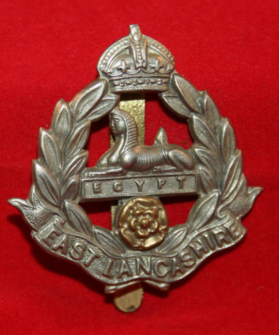 ish Army: East Lancashire Regiment Cap Badge. KK638. White metal with brass overlay on Rose. Slider fastener.