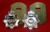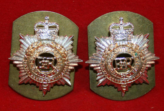 Royal Corps of Transport Collar Badge Pair. Queens Crowned, post 1953 manufacturer. 2 toned anodized metal. Each with a lug fastener on the back. Brass backing plate and cotter pins included.