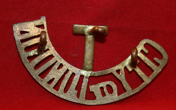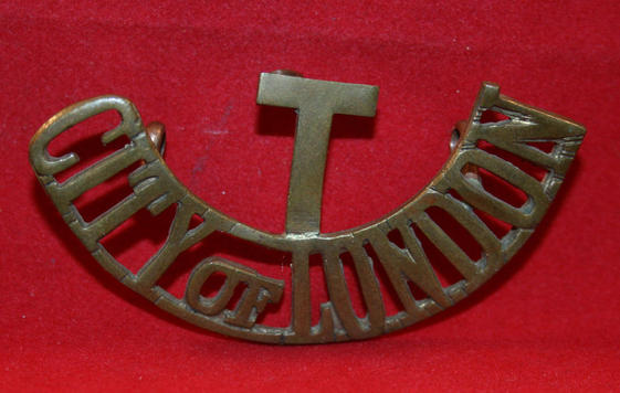British Army: Territorial Shoulder Title: T CITY OF LONDON. Brass metal, with lug fasteners.