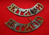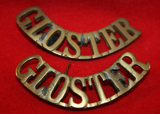The Gloucestershire Regiment Shoulder Title Pair. Brass metal. GLOSTER, curved down. 11mm high. With replaced fastener with wire, with one have a single wire only.