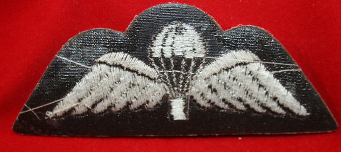 British Parachute Cloth Wing: Black wings on Red with Black Chute. Plastic on the back. Para. From the feel of it, I am assuming post WW2 issue.