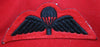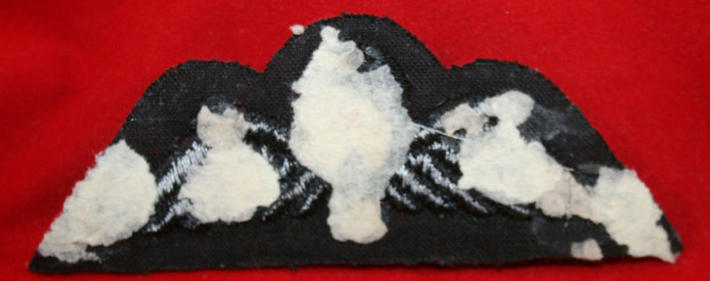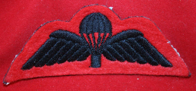 British Parachute Cloth Wing: Black wings on Red with Black Chute. Glue & paper on the back. Para. From the feel of it, I am assuming post WW2 issue.