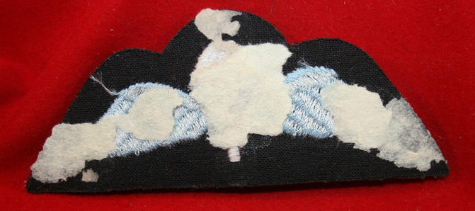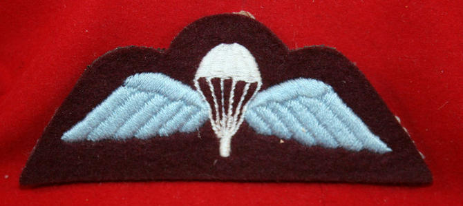 British Parachute Cloth Wing: Light Blue wings on Maroon with White Chute. Airborne. Spots of glue & paper on back. Para. From the feel of it, I am assuming post WW2 issue.