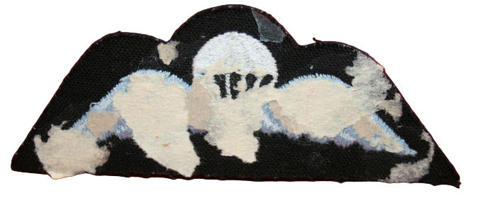 British Parachute Cloth Wing: Light Blue on Navy with White Chute. RAF ISSUE. Glue & paper residue on the back. Para. From the feel of it, I am assuming post WW2 issue.