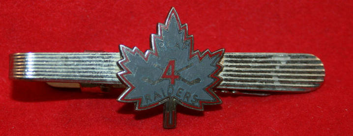 No. 4 WING, RCAF, RAIDERS, Hockey Team. This is a Tie bar, chrome metal with a colored enamel crest attached, 19mm x 21mm, showing the number 4 on Crossed Hockey Sticks with words RCAF and RAIDERS. Well made pin and excellent condition