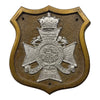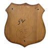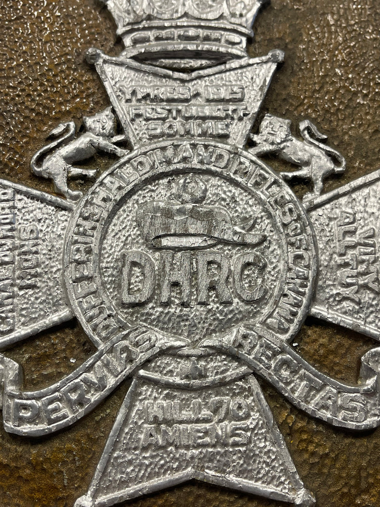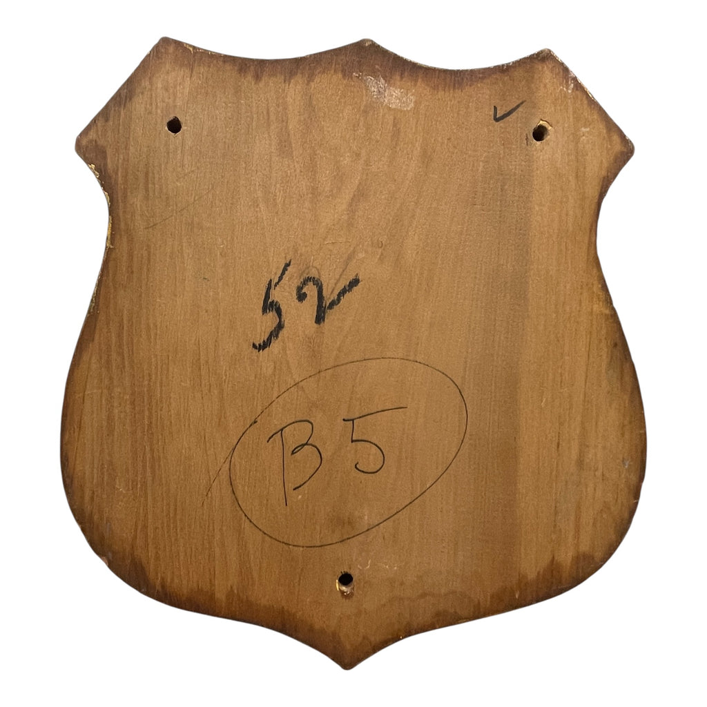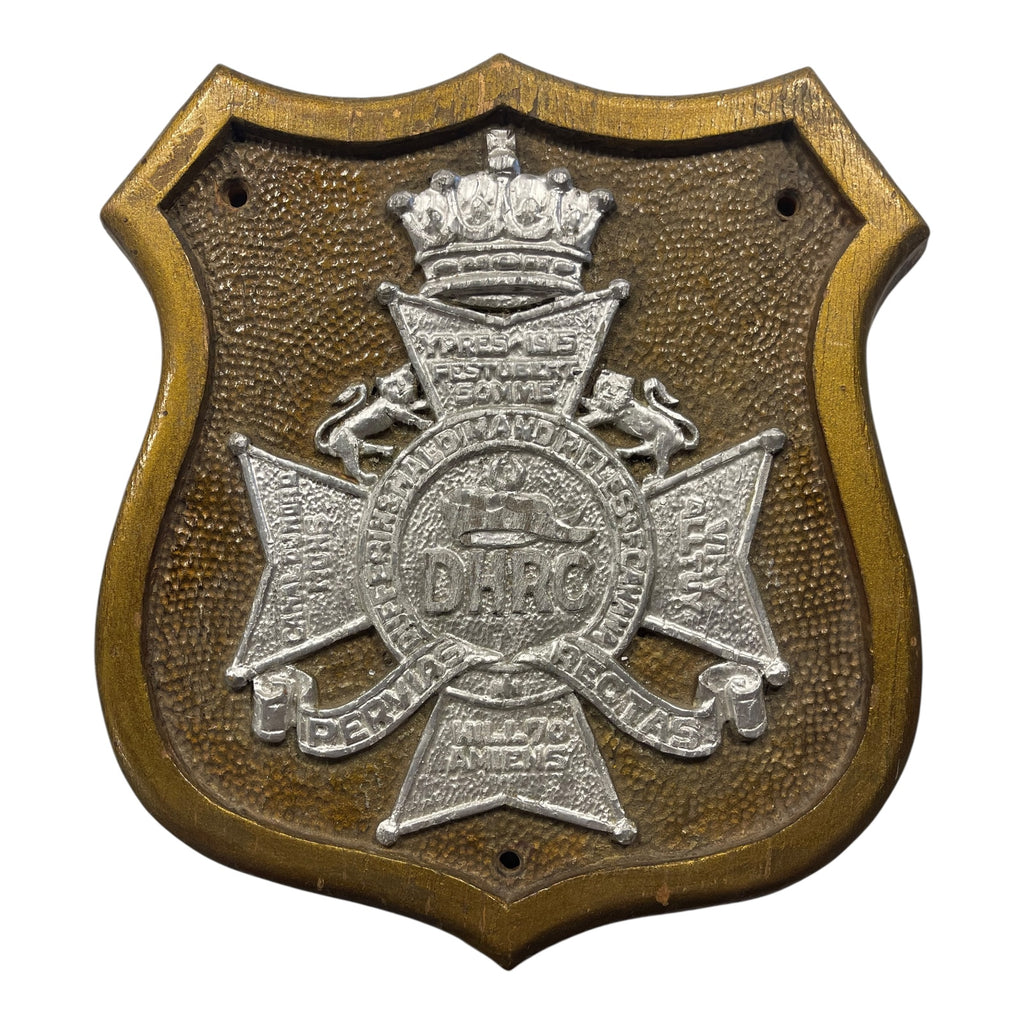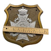 A really nice wooden plaque with engraved likeness of the DHRC badge . Outer border of the frame has been painted in gold, while the likeness of the badge has been painted in silver. Nice looking. Drilled with three holes to mount on wall.