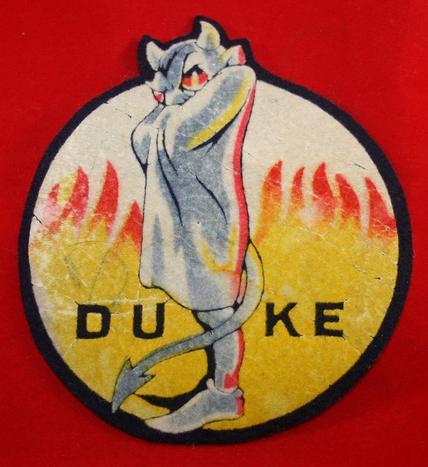 I am calling this a Military Crest but to be honest have "NO IDEA" what it is, could be School, Sports ect. Gray painted Flocking Devil design on colored Flames with word DUKE in black. Design on blue felt cloth backing. 5" high by 4 1/8" wide. Shows some aging to design but still interesting crest.