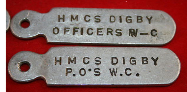 H.M.C.S. DIGBY, Bangor Class Minesweeper, Comm 1942, De-comm. 1945, Re comm 1953 to 1958., lot of 4 Aluminum Key Tabs, no keys. Each named to HMCS DIGBY and one for WARD ROOM STORE, C.O'S. CABIN/P.O.S W.C and OFFICERS W-C. Interesting & Unique.