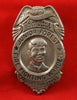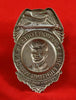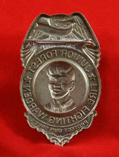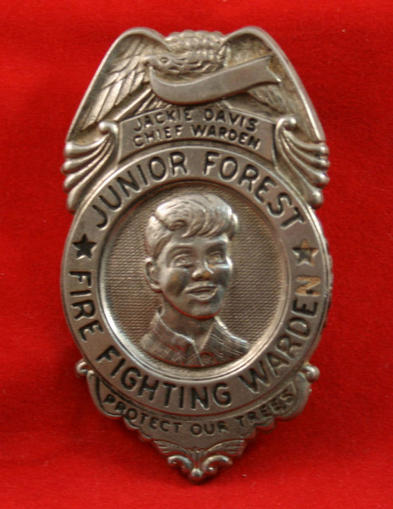 SOLETE - White metal Eagle Top badge with words in black, JACKIE DAIVIS on top banner and JUNIOR FOREST * FIRE FIGHTING WARDEN * and on circle banner and PROTECT OUR TREES on bottom banner. Pin back fastener, 1 5/8" x 2 3/4" high. Nice stamping.