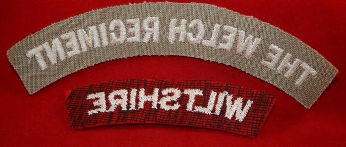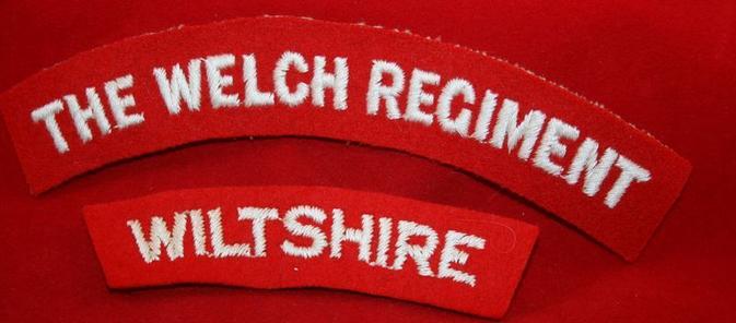 Lot of 2, Wiltshire & Welch Regiment Shoulder Title. Both are in New unused condition. White thread embroidered on red.