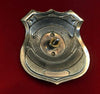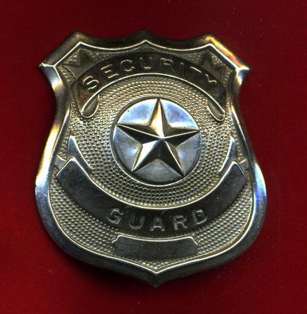OBSOLETE - White metal large heavy well made shield badge, 2 5/8" high by 2 1/4" wide. Words SECURITY GUARD on banners with attached 5 point Star circle disk centre. Single screw post with top retention pin fastener.