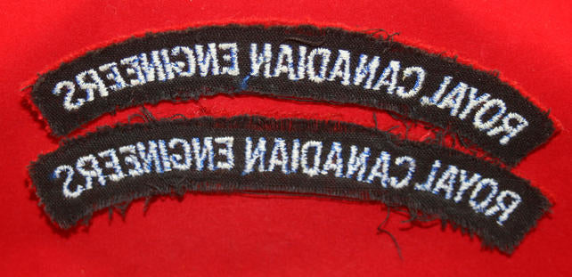 Pair: Royal Canadian Engineers Shoulder Title Pair. Worn WW2 and after. These appear to have been worn at one time.