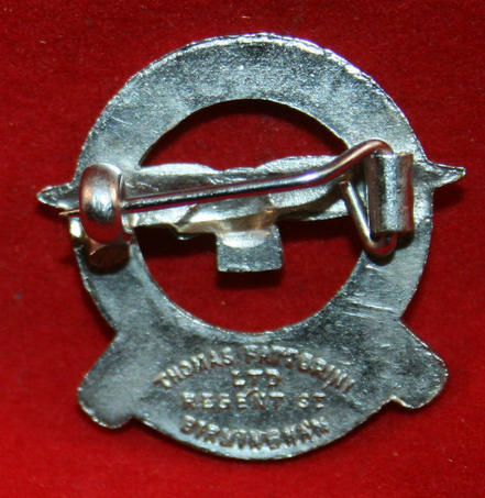 RAF, Royal Air Force pin. Circle banner with Flying Eagle inside and words R.A.F. COMFORTS COMMITTEE on it and bottom banner with words, VOLUNTARY WORKER on it. 24MM X 24MM. All banners backed in blue enamel. Pin back fastener. Maker marked, THOMAS FATTORINI/LTD/REGENT ST/BIRMINGHAM