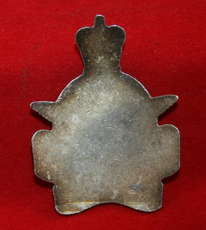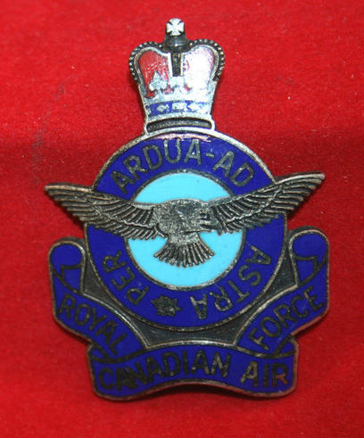 RCAF, Royal Canadian Airforce, Queens Crown crest. 42mm x 32mm, curved to fit on a cup or something, I would say. Queens Crown RCAF crest, with red and blue enamel in design. Small enamel chip under Crown on circle banner. Silver metal which doesn't test out to be silver, heavy plate. Nice large crest.