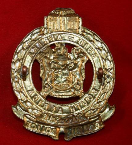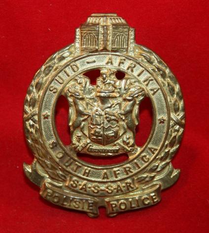 blic of South Africa Railway Police Helmet badge. Brass metal. Lug fasteners,.47mm wide by 59mm high, couple light brown stain spots lower left. Owen 1976. (This is the badge shown in Owens Book)