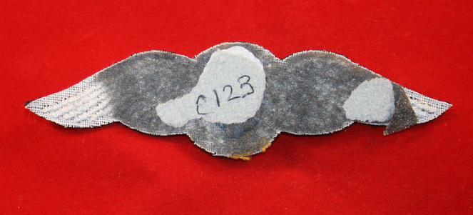 South Africa Army Air Reconnaissance Wings Cloth Patch. (Fake). Embroidered. Glue and paper on the back. Reference number C123 written in ink on paper.