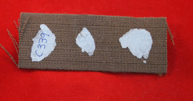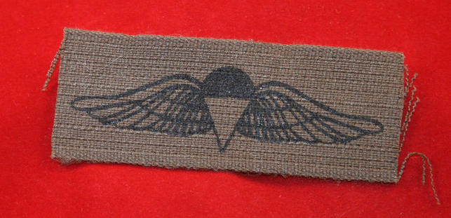 South African Wing. Notation from Owens book, Fake, Copy of the Basic Wing, Work Dress Cloth Patch. Printed. Glue and paper on the back. Reference number C339 written in ink on paper.