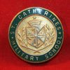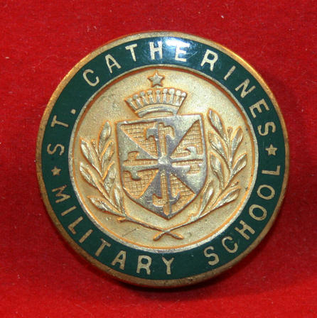 St. Catherines Military School Enameled Badge Pin. Gilt brass badge with green enameling. Pin and hook type fastener, pin removed. A quick google search mentions this school is in California, and not Ontario. 30mm wide.