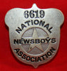 White metal, 1 3/4" x 1 5/8", shield, with words, 6619 NATIONAL NEWSBOYS ASSOCIATION in black lettering. Pin back fasteners. Heavy well made piece.