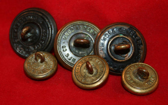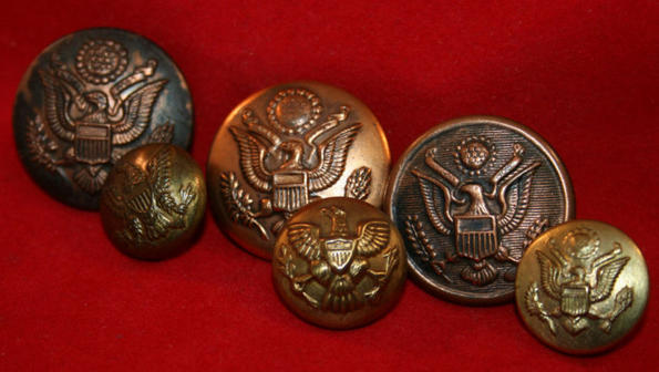 Usa Button Lot. Lot of 6. All General List Eagle Design. 3 - 25mm size, copper bronze, one with raised outer border, maker, Jeweler products CorpR.I. and two with no outer border, one Scovill Mfg. Co. Waterbury Conn. And other Horstman Philadelphia. 2 - 16mm size, dull gold, makers, A.M. Buttons Newark and Horstman Phila. 1 - 15mm size, Scovill S 7 Co. Extra.