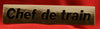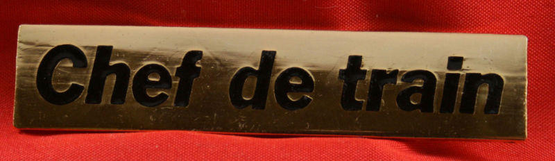VIA Train Brass Id Badge, Brass badge with black words Chef de train. Two fold over fasteners on the back. I believe these are worn on the jacket.
