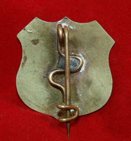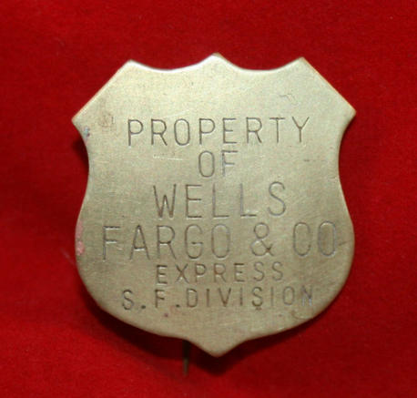 OBSOLETE - small brass shield, 1 1/8" x 1 1/4" high, with engraved words, PROPERTY/OF/ WELLS/ FARGO & CO/ EXPRESS/ S.F. DIVISION, pin back. Has been polished but still in excellent condition.