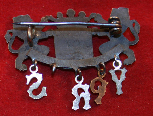 WW1 era, YPRES, souvenir pin. Silver metal with gold letters Y P R S (Missing the E) suspended below. The Y P R S letters appear to be Gold (I am told these are 9K gold but have never tested them) three piece, plus the gold letters. Pin back. 30mm x 33mm.