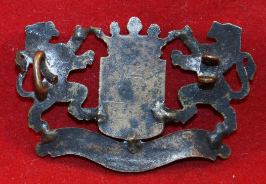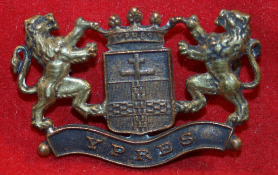 WW1 era, YPRES, souvenir pin. Brass and bronze metal. Pin back with pin missing but holder present. 33mm x 21mm.