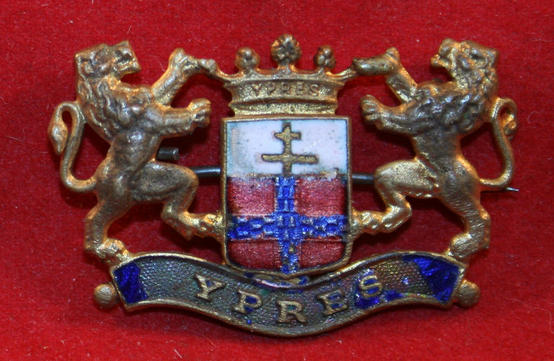 WW1 era, YPRES, souvenir pin. Base metal, dull gold plated, with metal showing due to wear, with colored enamel. Pin back. 33mm x 21mm.