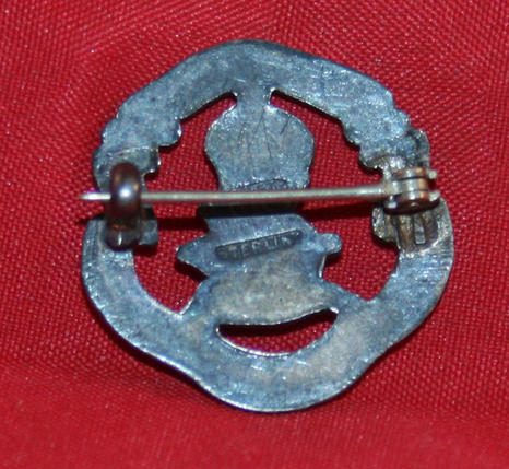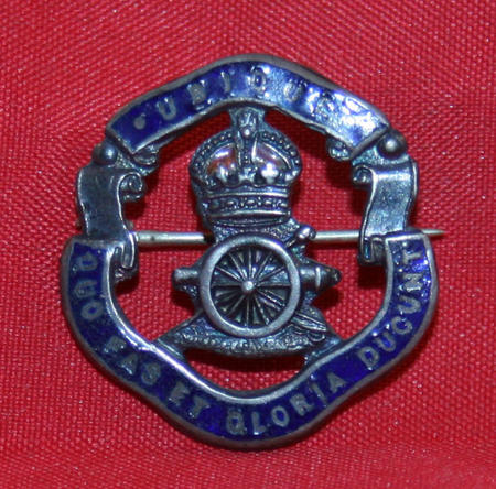 WW1 Royal Artillery Sweetheart Pin. Silver with red and blue enamel. Wear to enamel, but no damage. Pin back with hook catch. 25mm tall by 24mm wide. Maker stamped CU in rectangle (C.U into a rectangle