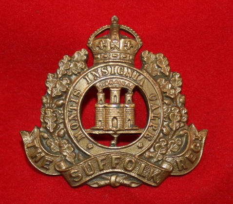 Suffolk Regiment Cap Badge. KK605. Toned Brass/ bronze, one piece, WW1 issue. One lug replaced other missing. Heavy, well made badge.