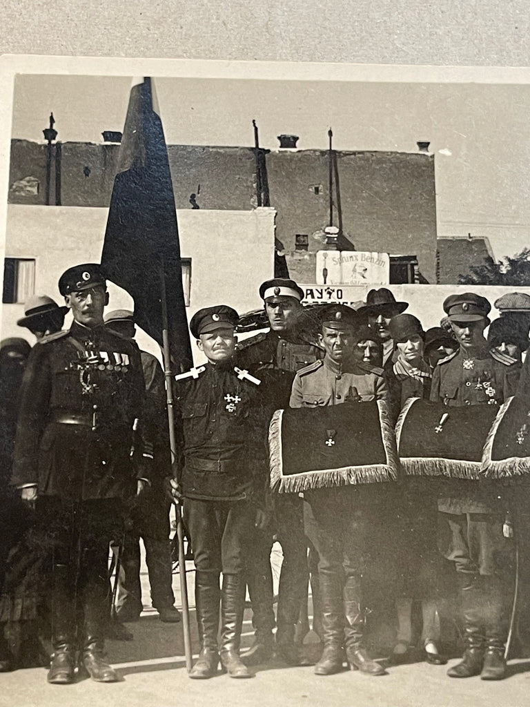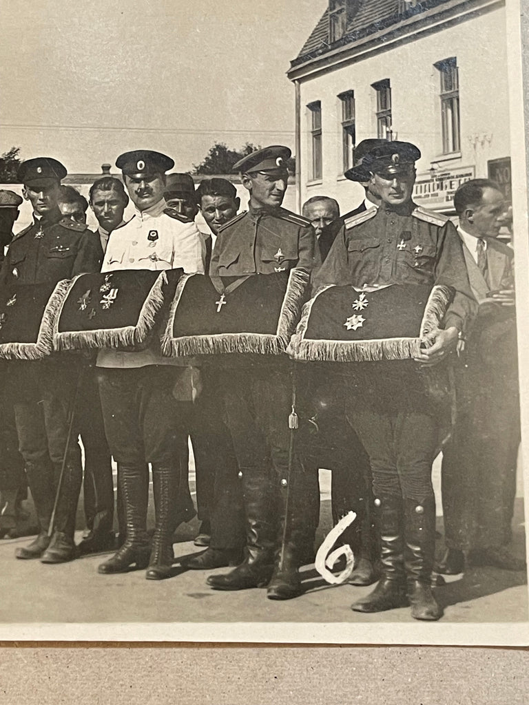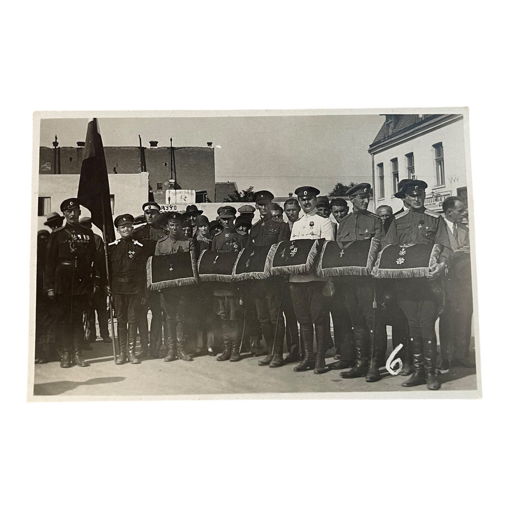 An un-used black and white postcard showing a group of German soldiers with awards on pillows. Very historic picture.