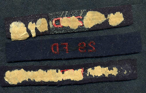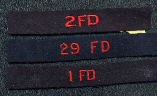1960 issue, Royal Canadian Artillery Flash lot. 1 FD, 2 FD and 29 FD, 11mm high number/letters, in red on black, all approx. 5" long, gauze type backing, two with paper and glue residue. All show some age darkening.