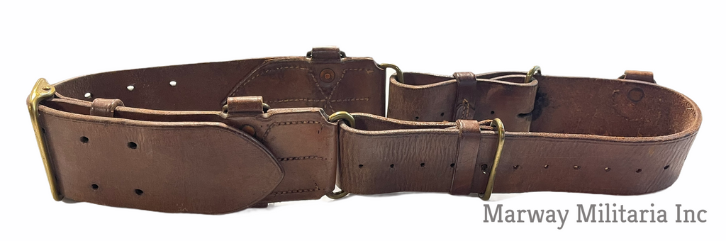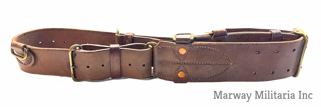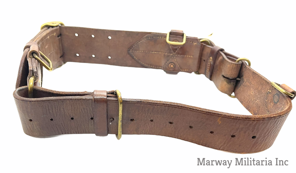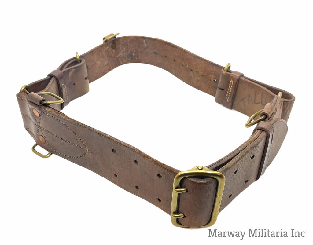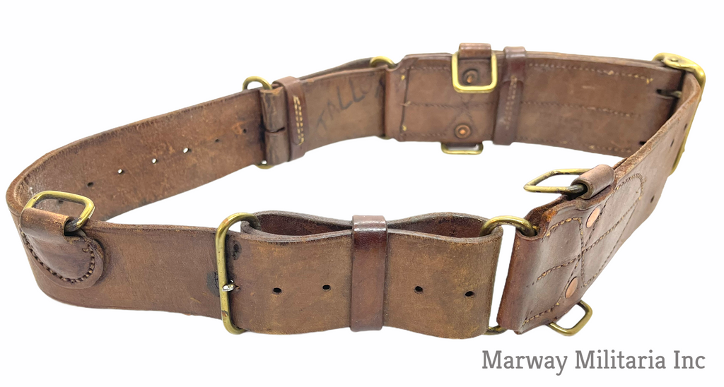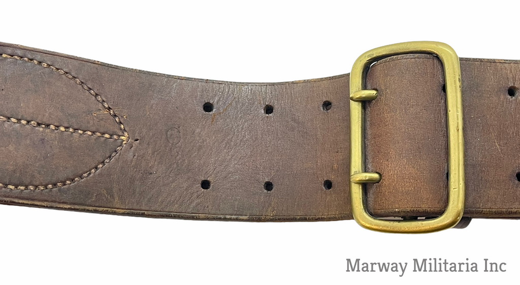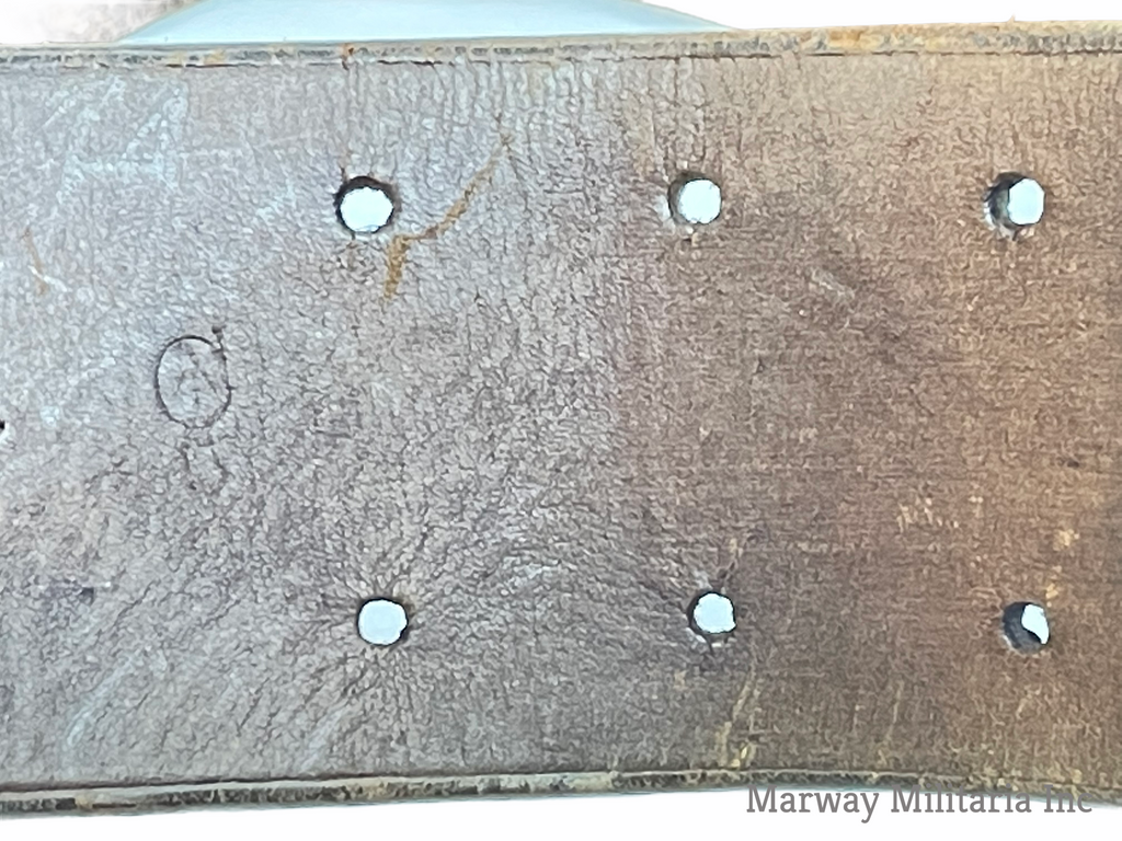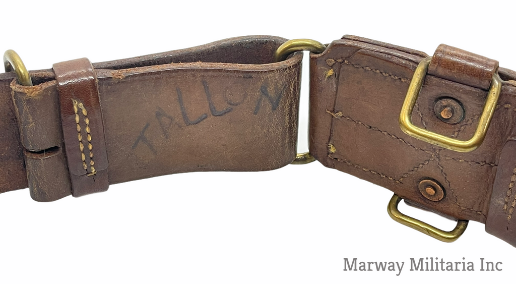 Stamped with a C broad Arrow and number 5 indicating 5th Western Cavalry. Name carved into the back, TALLON (I could not find a Tallon in the 5th). In very good condition, leather is still very soft and pliable. Belt is maker stamped S. TREES & CO LTD TORONTO 1916.